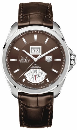 The elite TAG Heuer Men's Grand Carrera Automatic Chronometer Leather Watch includes a chronometer certification that guarantees its superior components and precise timekeeping. This timepiece is constructed with a stainless steel case, a stationary stainless steel bezel, and a brown crocodile-pattern leather wristband with a secure deployment push button clasp with buckle. A scratch-resistant sapphire window shields the rich brown dial, which features silver-dash hour markers, slim minute indexes, and complementing watch hands. The face also includes chronograph functions and a date calendar beneath the 12 o'clock position. This unique timepiece runs on Swiss-automatic movement that powers with the movement of your arms. In addition, it is water resistant to 330 feet.